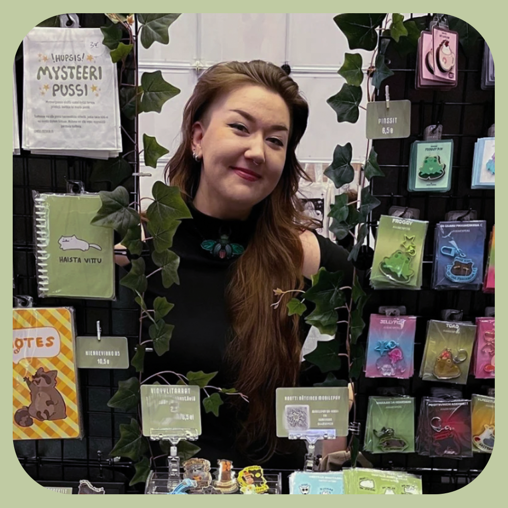 Olen taiteesta, elokuvista ja peleistä pitävä 25-vuotias naikkonen, ja valmistuin keväällä 2025 muotoilijaksi Savonia-ammattikorkeakoulusta. Asustelen Kuopiossa mieheni, sekä mustan maatiaskissan, Kuun, kanssa. Kuuta pääsee näkemään välillä somessa ja hän inspiroi välillä osaa tuotteistanikin!